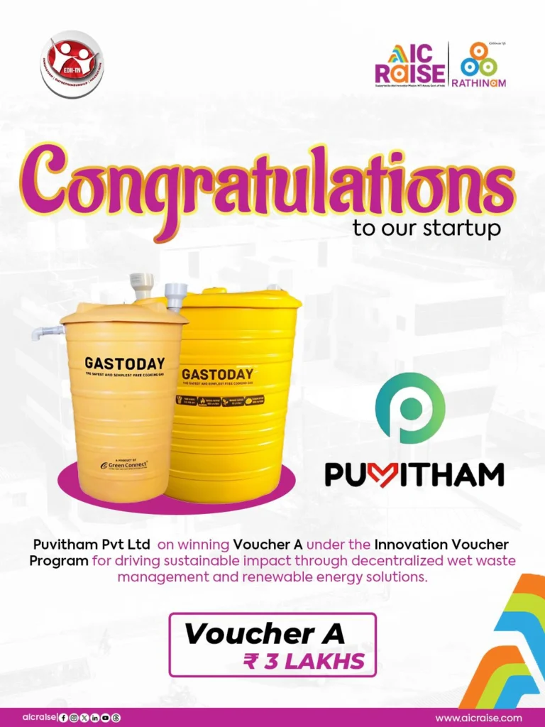 A big cheer to Puvitham Pvt Ltd for securing Voucher A worth ₹3 Lakhs under the prestigious Innovation Voucher Program! This recognition stands as a powerful testament to their dedication to creating meaningful, sustainable solutions that address some of today’s most pressing environmental challenges.